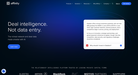 Affinity is relationship intelligence software that uses AI to track and surface connections. It automatically logs email and calendar interactions, suggests warm introductions, and identifies relationship strength. Particularly useful for deal teams that rely on networks for sourcing and introductions.