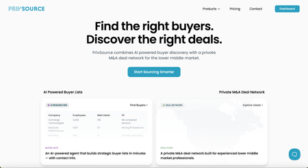 PrivSource is built specifically for lower and middle-market deal sourcing with two core products: a Buyer List tool (sell-side) and a Target List tool (buy-side). Both use AI agents to discover, rank, and enrich potential buyers or targets beyond what traditional databases surface. Tools like PrivSource help advisors automate the first 70% of buyer discovery by surfacing and ranking relevant acquirers with reasoning, which is particularly useful when working in niche verticals where obvious strategic acquirers don't exist in the usual datasets.