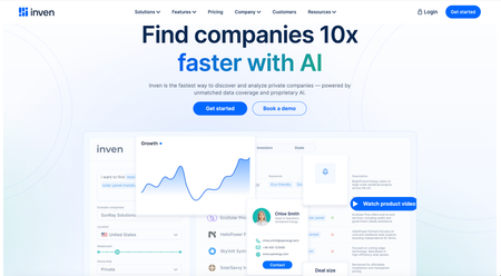 inven.ai focuses on private company intelligence and buy-side sourcing within a database framework. It uses AI to identify companies based on operational characteristics rather than just industry codes. Strong for mapping fragmented markets where you're looking for companies that behave a certain way (e.g., growing regional players in home services, B2B SaaS companies expanding into specific verticals). The platform's strength is pattern detection across unstructured signals—hiring data, technology stack changes, geographic footprint expansion.