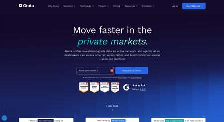 Grata is one of the more established AI-enhanced databases, particularly strong for middle-market private company search. It uses machine learning to classify companies based on what they actually do (parsed from websites, job postings, news) rather than relying on SIC/NAICS codes. The search interface is intuitive, and the company descriptions are generally accurate.